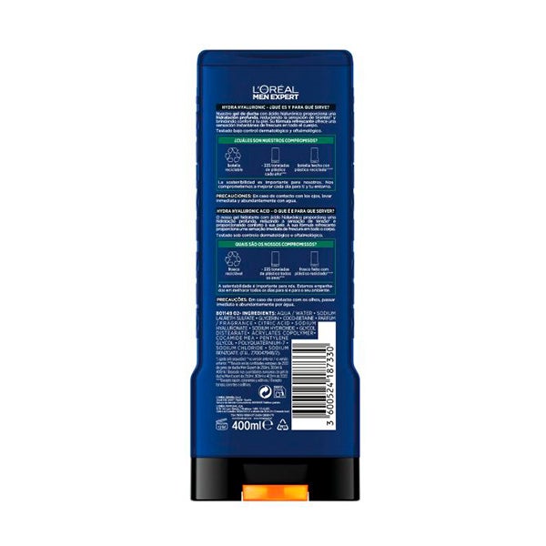 O Gel de Banho Hydra Hyaluronic da L'Oréal Men Expert está formulado com ácido hialurônico, um ingrediente conhecido por sua capacidade de reter a hidratação e melhorar o conforto da pele.