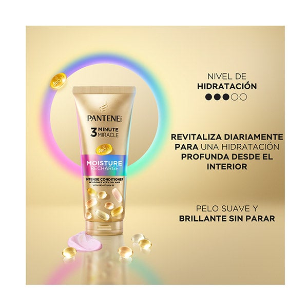 Descubra o condicionador intensivo Pantene Hydra Revitaliza 3 Minute Miracle, seu resgate definitivo para o cabelo muito seco. Enriquecido com Pro-Vitamina B5, lipídios fortificantes e antioxidantes protetores, esta rica fórmula penetra instantaneamente no cabelo, hidratando-o em profundidade com nutrientes hidratantes. Com apenas um uso, transforma seu cabelo seco em mechas macias e brilhantes. Com quatro formas diferentes de utilizá-lo, combine-o com o restante da coleção Hydra Revitaliza para obter uma rotina de cuidado capilar completa e nutritiva.