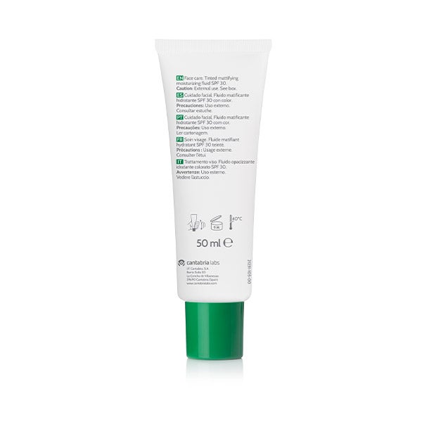 Fluido hidratante com cor. Ajuda a disfarçar imperfeições e oferece uma ação seborreguladora-matificante com proteção SPF30.