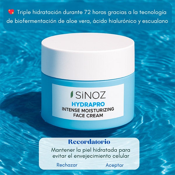 O Creme Hidratante Intenso da Sinoz oferece uma tripla hidratação de longa duração (até 72 horas) graças à sua inovadora tecnologia de biofermentação de aloe vera, ácido hialurônico e esqualano.