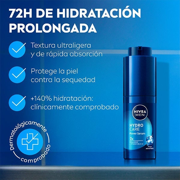 NIVEA MEN HYDROCARE Power Serum Oferece uma hidratação intensa e duradoura com efeito de depósito por até 3 dias. Penetra nas camadas mais profundas da epiderme para proporcionar hidratação sem sensação pesada. Pele hidratada, revitalizada e cheia de energia. Previne o ressecamento. RESULTADO CLINICAMENTE COMPROVADO +140% de hidratação após apenas uma aplicação. Sua fórmula refrescante e de rápida absorção é potencializada com 2X Ácido Hialurônico + Vitaminas B5, C e E. Proporciona 72 h de hidratação após uma única aplicação. Combinação poderosa de 2 tipos de ácido hialurônico puro para uma sensação de hidratação duradoura: • Macro-Ácido Hialurônico: hidrata intensamente a superfície da pele. • Micro-Ácido Hialurônico: penetra em camadas mais profundas para preencher os depósitos de hidratação da pele. Recomendado por homens 96% dos homens confirmaram: “sensação de hidratação duradoura desde a primeira aplicação”.