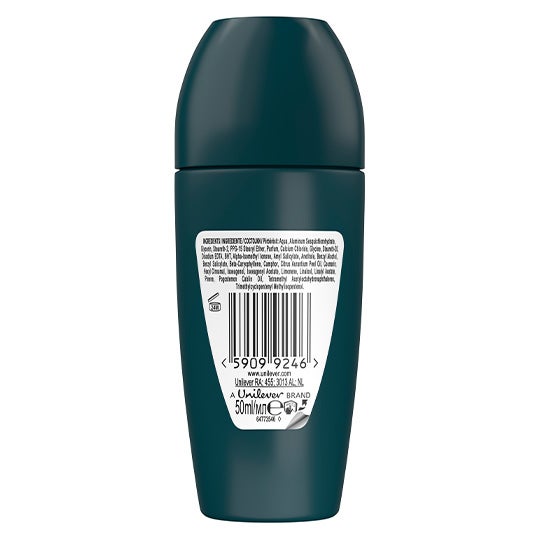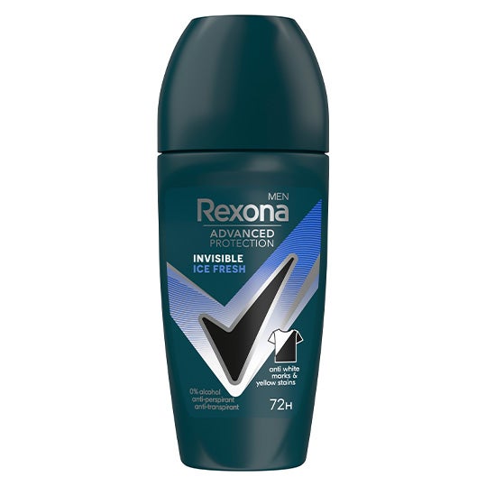 Desodorante antitranspirante em roll on para homem Rexona Invisível Ice com tecnologia antimanchas e fórmula 0% álcool.