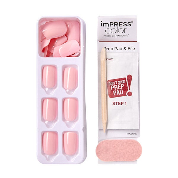 O kit contém 30 unhas, almofada de preparação, mini lixa e palito de cutículas.