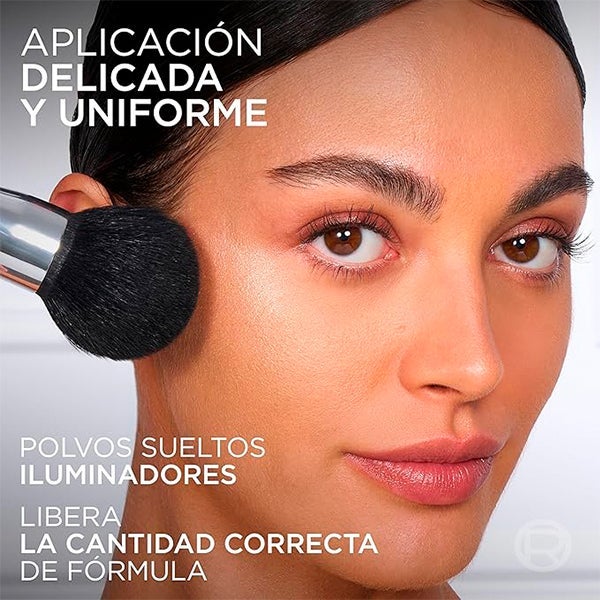 Aplique o pó com um pincel ou um aplicador. Pressione suavemente ou deslize sobre as áreas faciais desejadas para fixar sua maquiagem perfeitamente.
