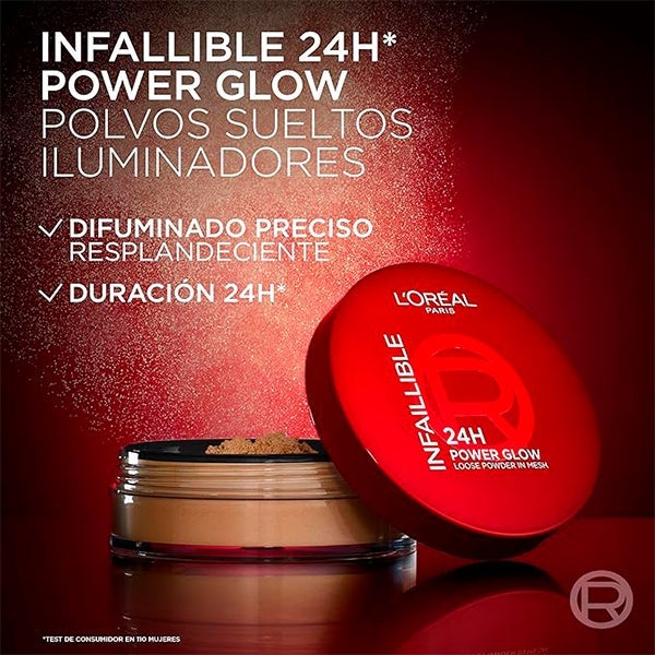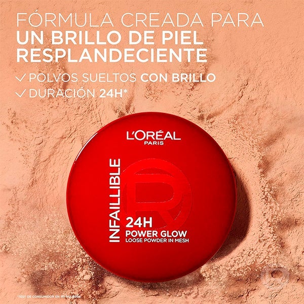 L'Oréal Paris Infallible 24H Power Glow Loose Powder. Fórmula hidratante e respeitosa com a pele com pérolas planas. Para um brilho difuso na pele e um acabamento radiante que dura até 24H. A fórmula respeitosa com a pele, com pérolas planas, proporciona um brilho impecável que difunde a pele e dá um acabamento refinado e radiante que dura 24H