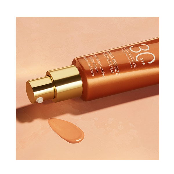 Infinite Bronze Tinted Protection Sunlight Cream SPF30 es una base de maquillaje en crema luminosa y ligera que unifica y broncea la piel y difumina visiblemente las imperfecciones gracias a sus pigmentos y microperlas de alto rendimiento.