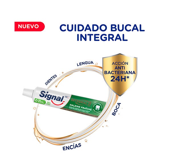 A nova fórmula do creme dental Signal Integral 8 Frescor Integral é a forma mais natural eficaz de escovar os dentes.