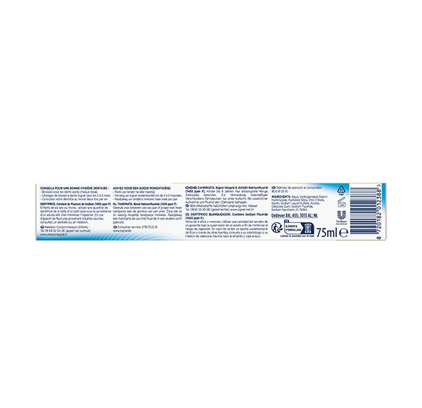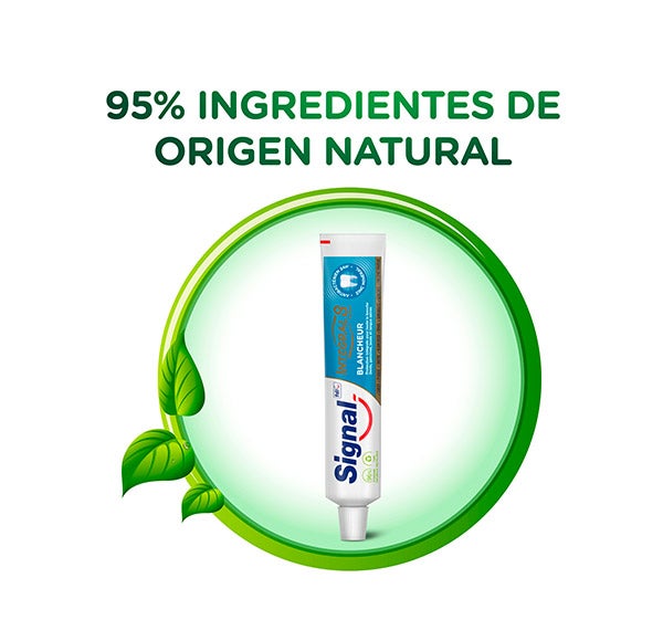 A fórmula do creme dental Signal Integral 8 Branqueador é elaborada com 95% de ingredientes de origem natural e sua fórmula suave é enriquecida com extratos de plantas para uma sensação de frescor duradoura.