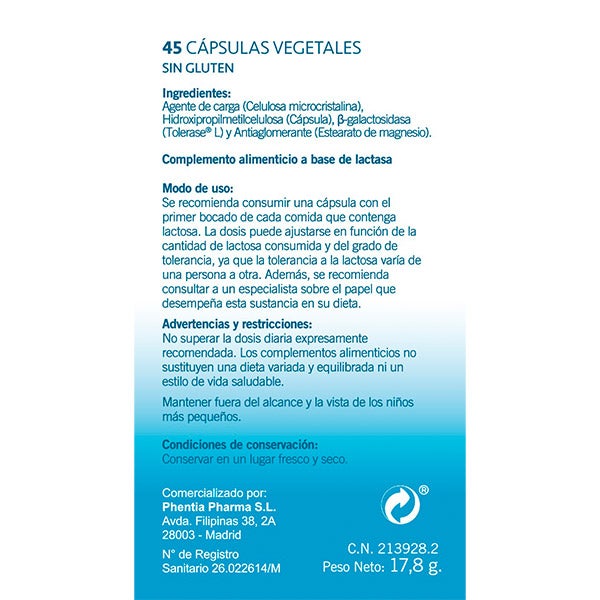 Agente de carga (Celulosa microcristalina), Hidroxipropilmetilcelulosa (Cápsula), β-galactosidasa (Tolerase® L) y Antiaglomerante (Estearato de magnesio).