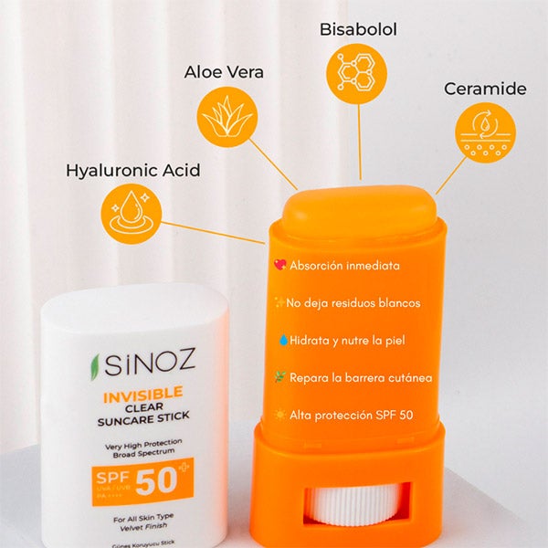 O Protetor Solar Stick Invisível SPF 50 da Sinoz oferece uma proteção solar muito alta contra os raios UVA e UVB, em um formato prático, confortável e 100% transparente. Desliza facilmente sobre a pele sem deixar marcas brancas, nem sensação pegajosa ou oleosa.