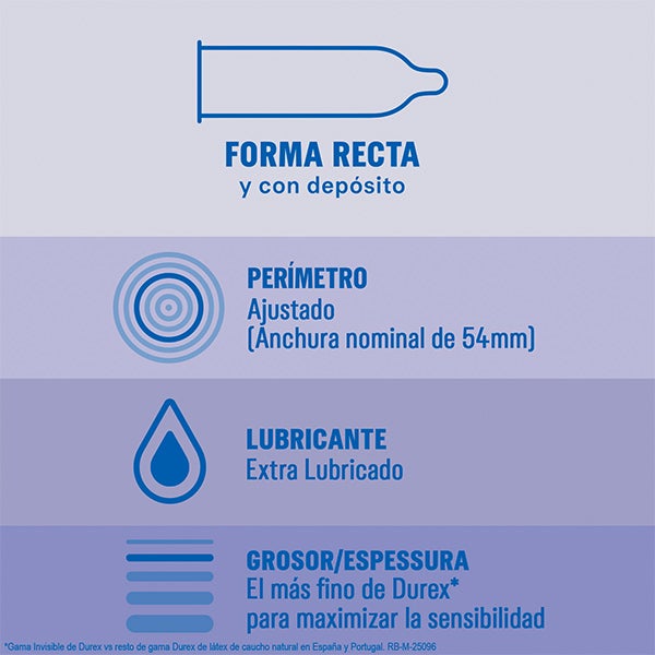 Os preservativos Durex Invisible Extra Lubrificado, os preservativos mais finos da Durex*, estão projetados para ser super finos e assim maximizar a sensibilidade. Ainda assim, continuam oferecendo um alto nível de segurança e proteção. Esses preservativos são transparentes, de forma reta e com reservatório. Também com mais lubrificante para uma experiência mais prazerosa.