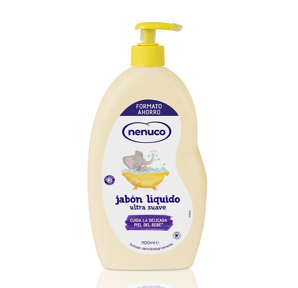 O sabonete líquido ultra suave Nenuco cuida do seu bebê, limpando e proporcionando suavidade à sua pele delicada graças ao extrato de Aloe e à Vitamina E.
