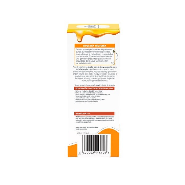 Miel de flores (17,4%), E422 glicerol (17,4%), fructosa, E464 hidroxipropilmetilcelulosa, extracto de Hedera helix L. (hoja) soportado en maltodextrina (0,26%), E415 goma xantana, E202 sorbato de potasio, sabor a albaricoque, E330 ácido cítrico, sabor a limón, agua purificada.