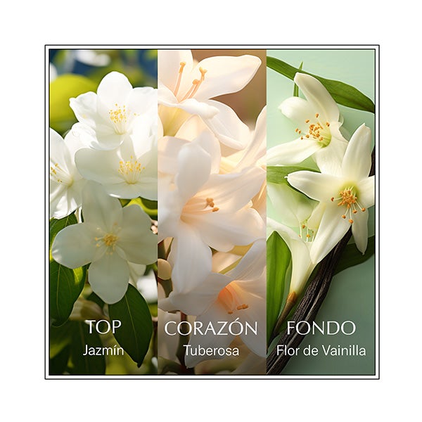 Esta fragrância meticulosamente elaborada combina o doce jasmin, vibrantes folhas verdes, tuberosas e notas de almíscar para criar assim um aroma cativante e envolvente.