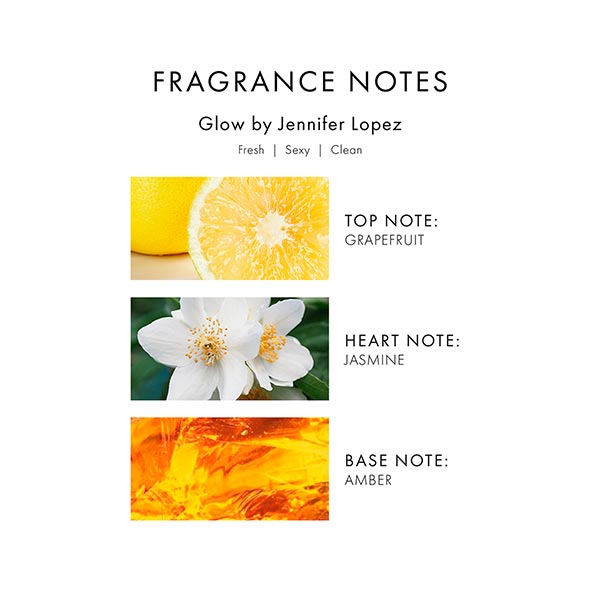 Glow contém notas de saída de flor de laranjeira e toranja, notas de coração de rosa, jasmim e tuberosa, e notas de fundo de almíscar, baunilha, sândalo e âmbar. A combinação cria um aroma floral puro, cativante e sedutor.