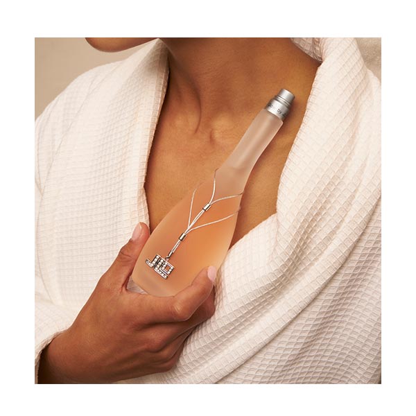 O icônico frasco translúcido, adornado com um colar, exibe um acabamento fosco e uma silhueta que imortaliza a célebre forma do corpo de Jennifer López. É um impressionante tributo à sua beleza atemporal.