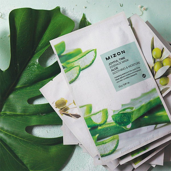 Máscara de tecido com extrato de folha de aloe vera, um ingrediente com propriedades hidratantes e calmantes.