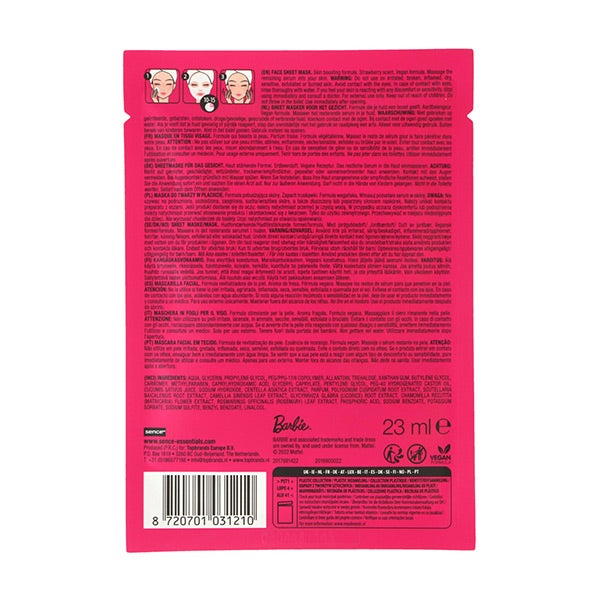 Esta máscara Sence Barbie é como um potencializador para sua pele, com uma fórmula estimulante e um suculento aroma de morango.