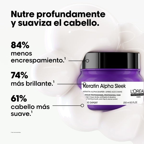 Máscara profissional Keratin Alpha Sleek da L'Oréal Professionnel, formulada com Modelador Keratin-Alpha e cadeias de Aminoácidos. A máscara capilar profissional possui uma textura rica e sensorial que nutre profundamente enquanto remodela e suaviza a queratina do cabelo. Suaviza e hidrata o cabelo, e proporciona um brilho instantâneo e controle do frizz e do volume. Use a rotina completa que transforma o cabelo para uma suavidade e frizz controlado por até 2 semanas*. Adequado para todos os tipos de cabelo.