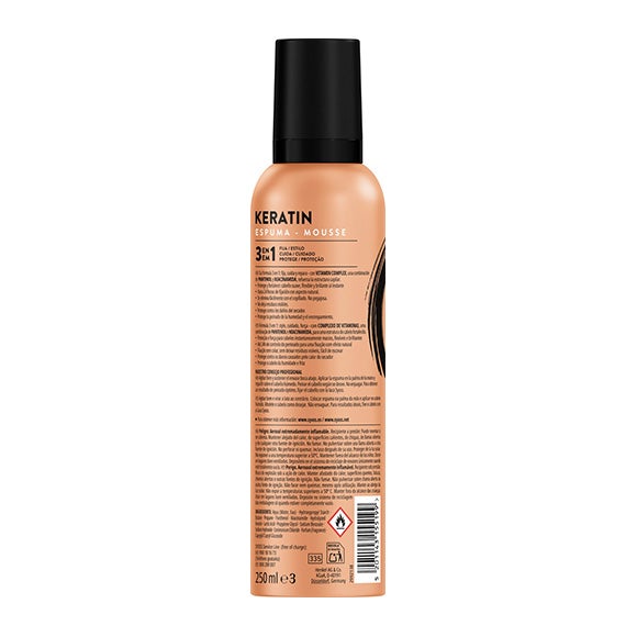Espuma Keratin Mousse da Syoss. Syoss Espuma Keratin fortalece e cuida o cabelo, com queratina. Espuma Keratin Mousse da Syoss oferece 48h de fixação extra forte.