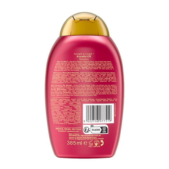 O Shampoo com Óleo de Queratina da OGX tem 5 benefícios em 1; ajuda a fortalecer o cabelo, a dar-lhe flexibilidade, o protege contra a umidade, mantém-no sem frizz e dá-lhe brilho.