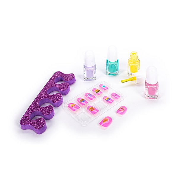 Kit completo para realizar sua manicure completa, com separador, 4 esmaltes e unhas artificiais com imagens divertidas.