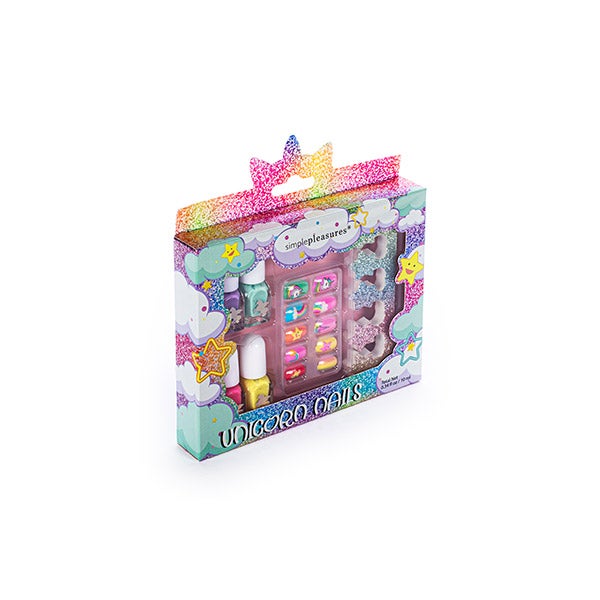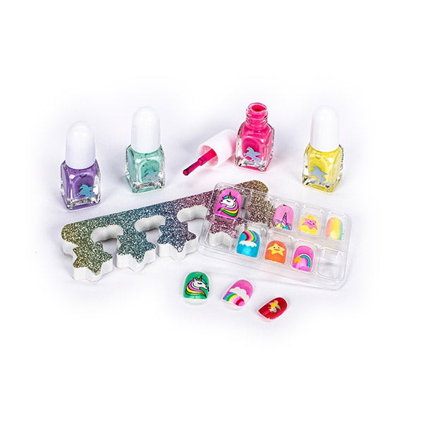 Contém quatro esmaltes de tons vivos, unhas postiças com designs mágicos e separador de unhas.