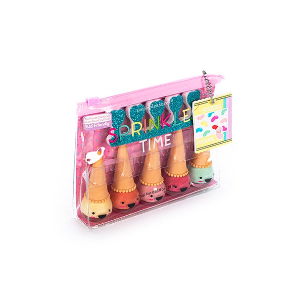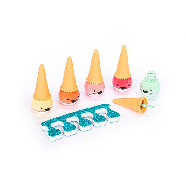 Contém cinco esmaltes em cores pastel com uma embalagem de sorvete linda.