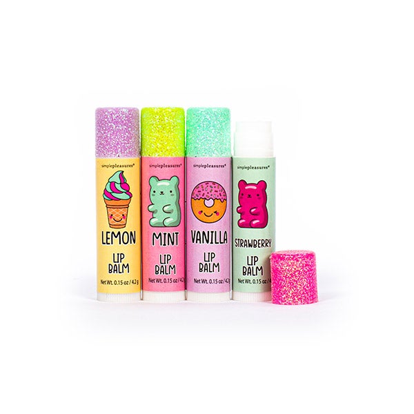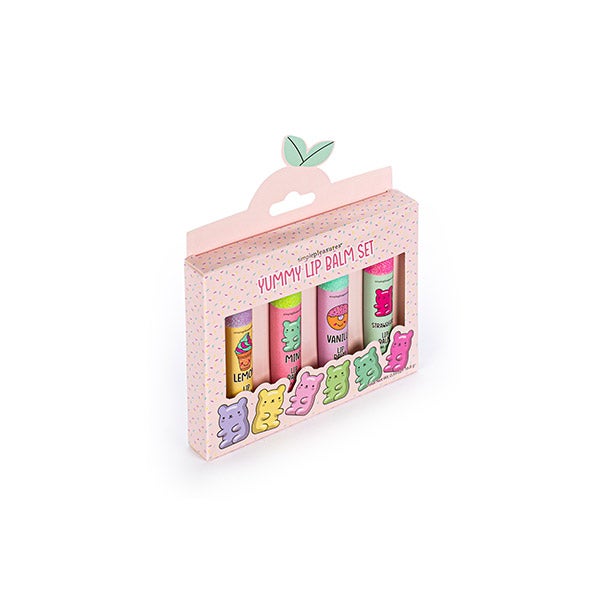 Contém cinco bálsamos labiais de sabores. Limão, menta, baunilha e morango.