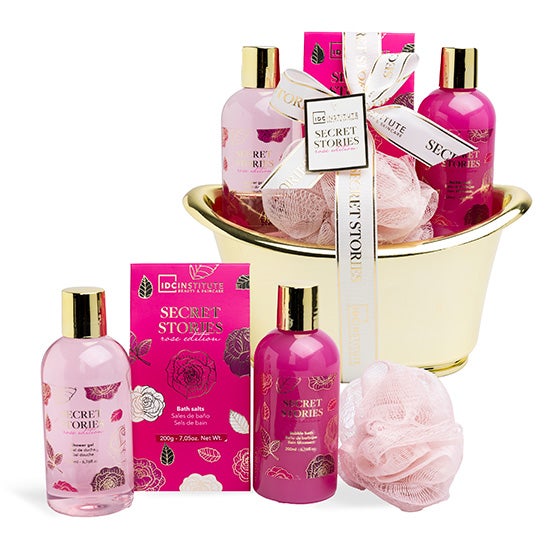 O nosso conjunto Secret Stories, com sais de banho, gel de banho, banho de espuma e esponja de banho, mergulha você em um luxuoso spa em casa. O aroma de rosas e peônias transforma o seu banho em um oásis de relaxamento, mimando a sua pele e os seus sentidos.