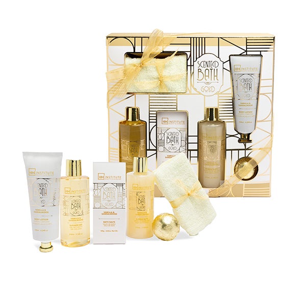 Mergulhe no luxo com o conjunto de presente Scented Bath Gold. Inclui um óleo e uma loção corporal com brilho dourado, perfumados com baunilha e sândalo.
