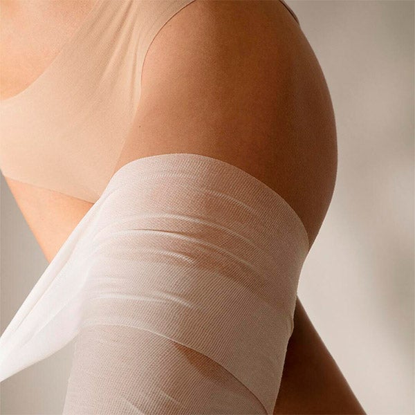 2) Ao chegar ao joelho, estique a perna e continue envolvendo até a virilha.