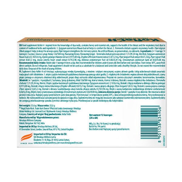 Koflet-H gengibre HIMALAYA é benéfico para combater a tosse seca e produtiva. Reduz a irritação da mucosa brônquica. As propriedades anti-inflamatórias de Koflet-H reduzem a inflamação do trato respiratório superior.
