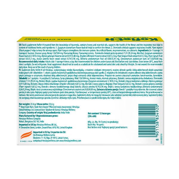 Koflet-H limão HIMALAYA é benéfico para combater a tosse seca e produtiva. Reduz a irritação da mucosa brônquica. As propriedades anti-inflamatórias de Koflet-H reduzem a inflamação do trato respiratório superior.