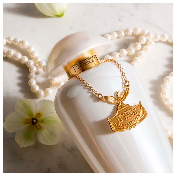 Um elegante frasco opalescente que contém uma fragrância floral, empoeirada e almiscarada, caracterizada por delicadas e suaves notas de flores brancas para homenagear o Teatro veneziano e suas prestigiadas intérpretes femininas.
