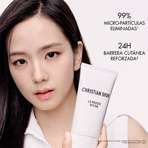 A espuma de limpeza facial La Mousse OFF/ON, enriquecida com crioextrato de lírio-d'água branco e niacinamida reforça a barreira cutânea e proporciona hidratação e um acabamento radiante à tez. Sua textura cremosa se transforma em uma espuma leve e perfumada ao contato com a pele.