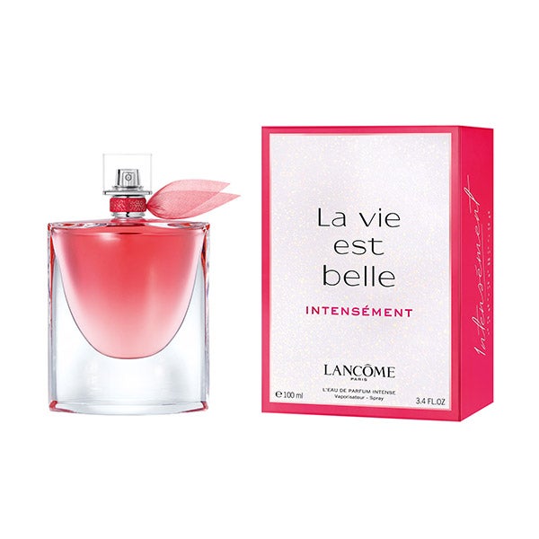 O perfume feminino, La Vie est Belle Intensément oferece um frasco retangular que mostra o emblemático sorriso de cristal, adornado com um intenso laço fúcsia que simboliza as asas da liberdade que caracterizam a filosofia da fragrância.