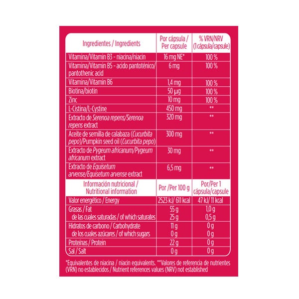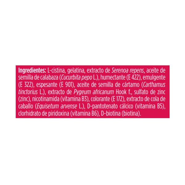L-cistina, gelatina, extracto de Serenoa repens, aceite de semilla de calabaza (Cucurbita pepo L.), humectante (E 422), emulgente (E 322), espesante (E 901), aceite de semilla de cártamo (Carthamus tinctorius L.), extracto de Pygeum africanum Hook f., sulfato de zinc (zinc), nicotinamida (vitamina B3), colorante (E 172), extracto de cola de caballo (el fortalecimiento y crecimiento del cabello L.), D-pantotenato cálcico (vitamina B5), clorhidrato de piridoxina (vitamina B6), D-biotina (biotina).