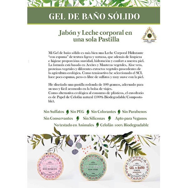 A fórmula deste gel de banho é baseada em Óleos e Manteigas vegetais, aloe vera, proteínas vegetais e diferentes extratos vegetais, todos provenientes da agricultura ecológica.