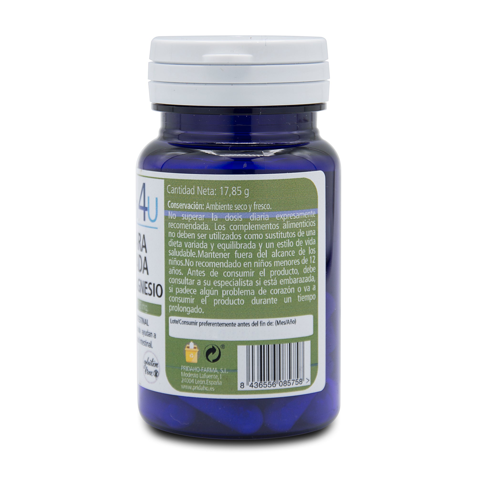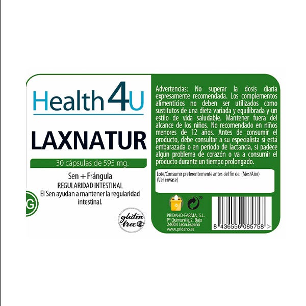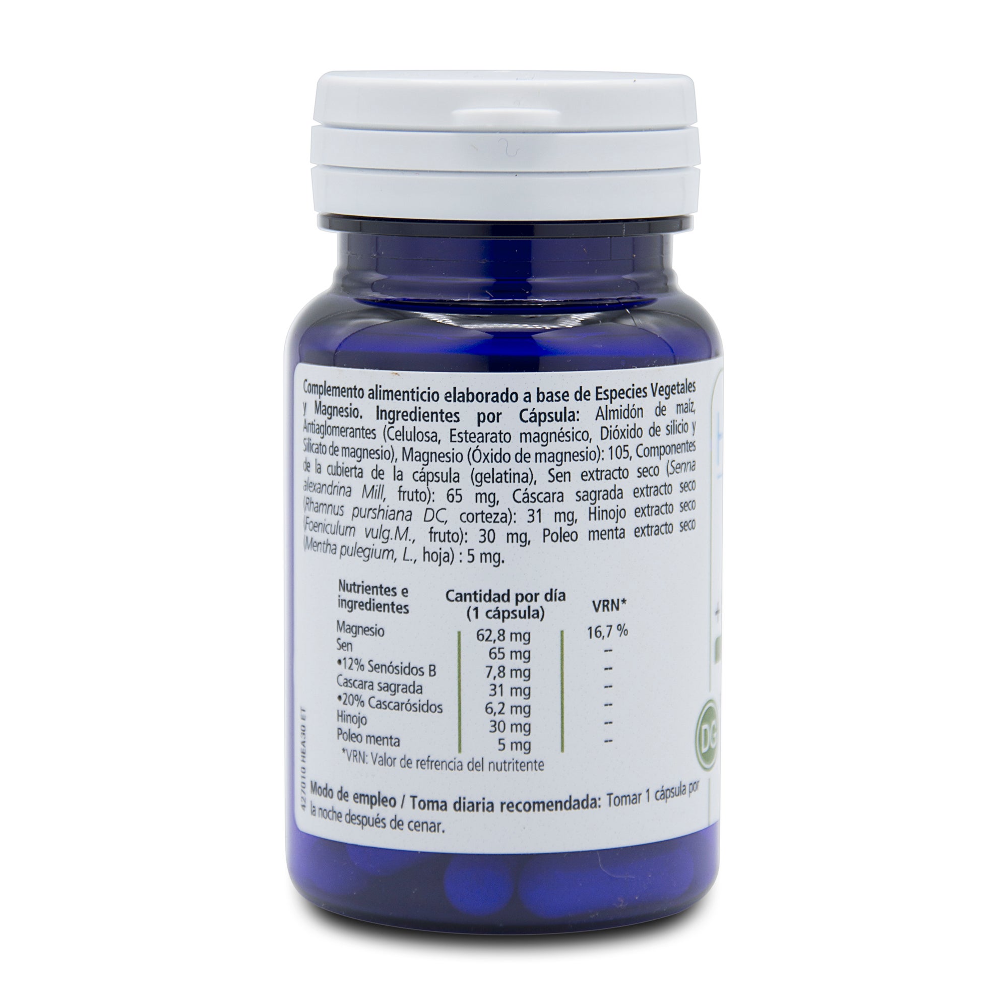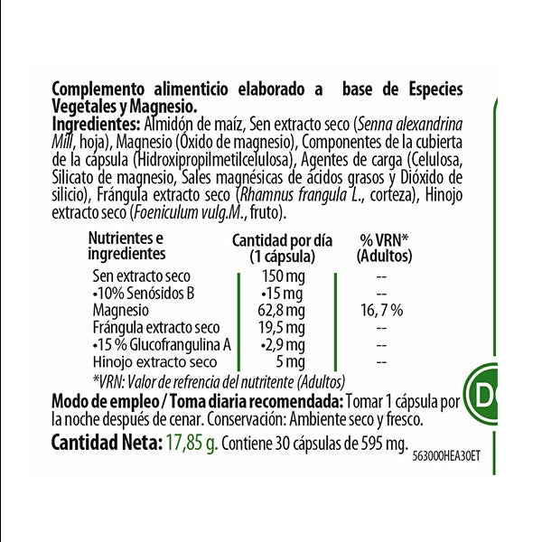 Ingredientes: Almidón de maíz, sen extracto seco (senna alexandrina mil, hoja), Magnesio (Óxido de magnesio), componentes de la cubierta de la capsula (Hidroxipropilmetilcelulosa), Agente de carga (Celulosa, Silicato de magnesio, Sales magnésicas de ácidos grasos y dióxido de silicio), Frángula extracto seco (Rhammus frangula L., corteza), Hinojo extracto seco (Foeniculum vulg.M., fruto).