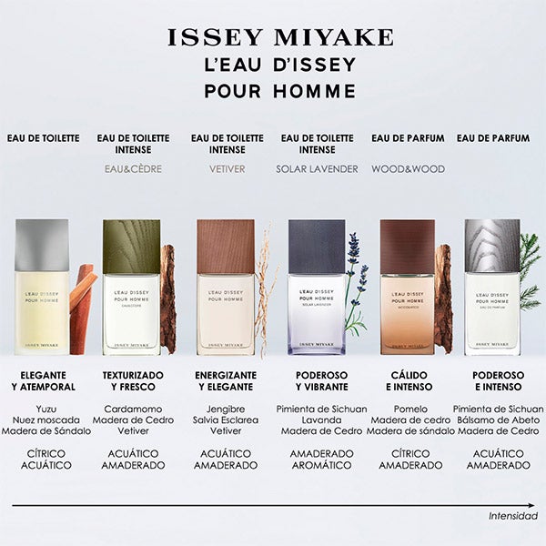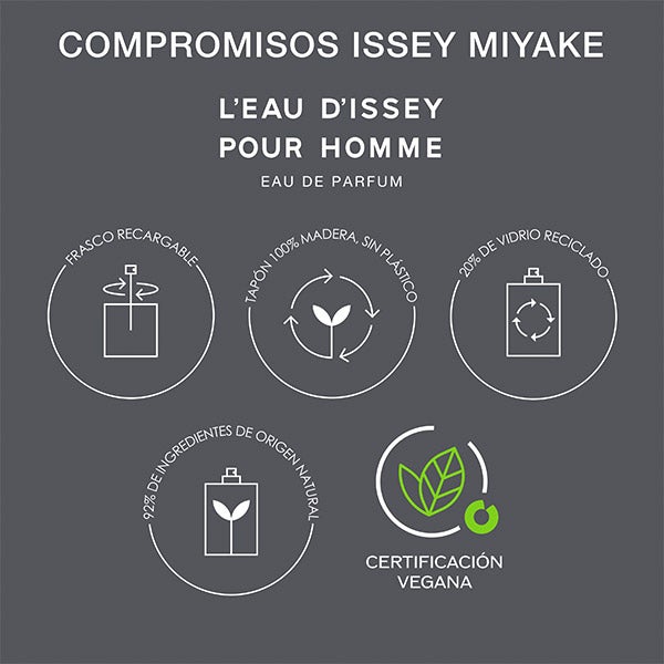 L'Eau d'Issey pour Homme Eau de parfum é uma fragrância vegana, elaborada com 92% de ingredientes de origem natural. A madeira de cedro de origem 100% natural é reciclada. O bálsamo de abeto e a pimenta de Sichuan são 100% naturais e de origem responsável.