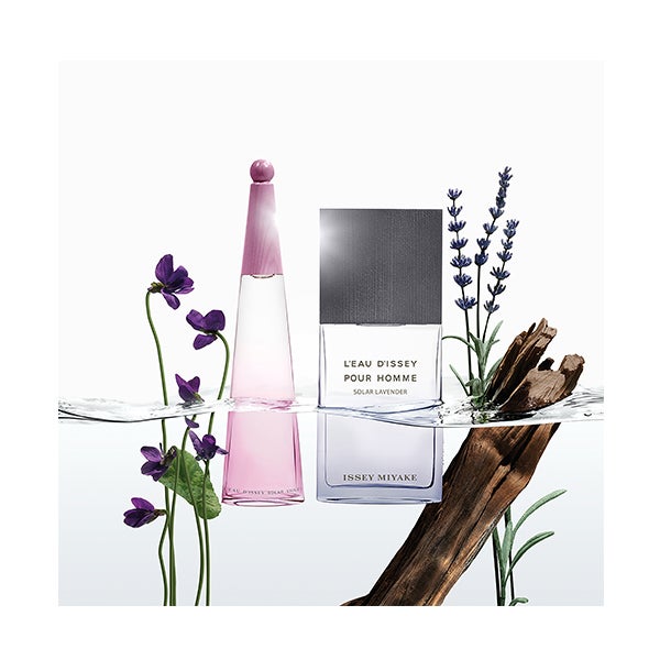 Impregnados de lavanda tanto por dentro quanto por fora, o frasco e a caixa de L'Eau d'Issey pour Homme Solar Lavender estão banhados em uma leve tonalidade púrpura cheia de sol. O frasco de vidro transparente reflete a pureza da água, enquanto a tampa 100% de madeira evoca a densidade da matéria.