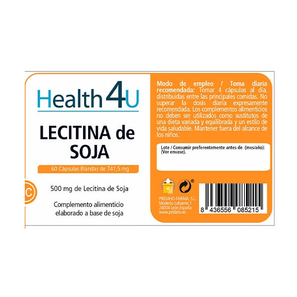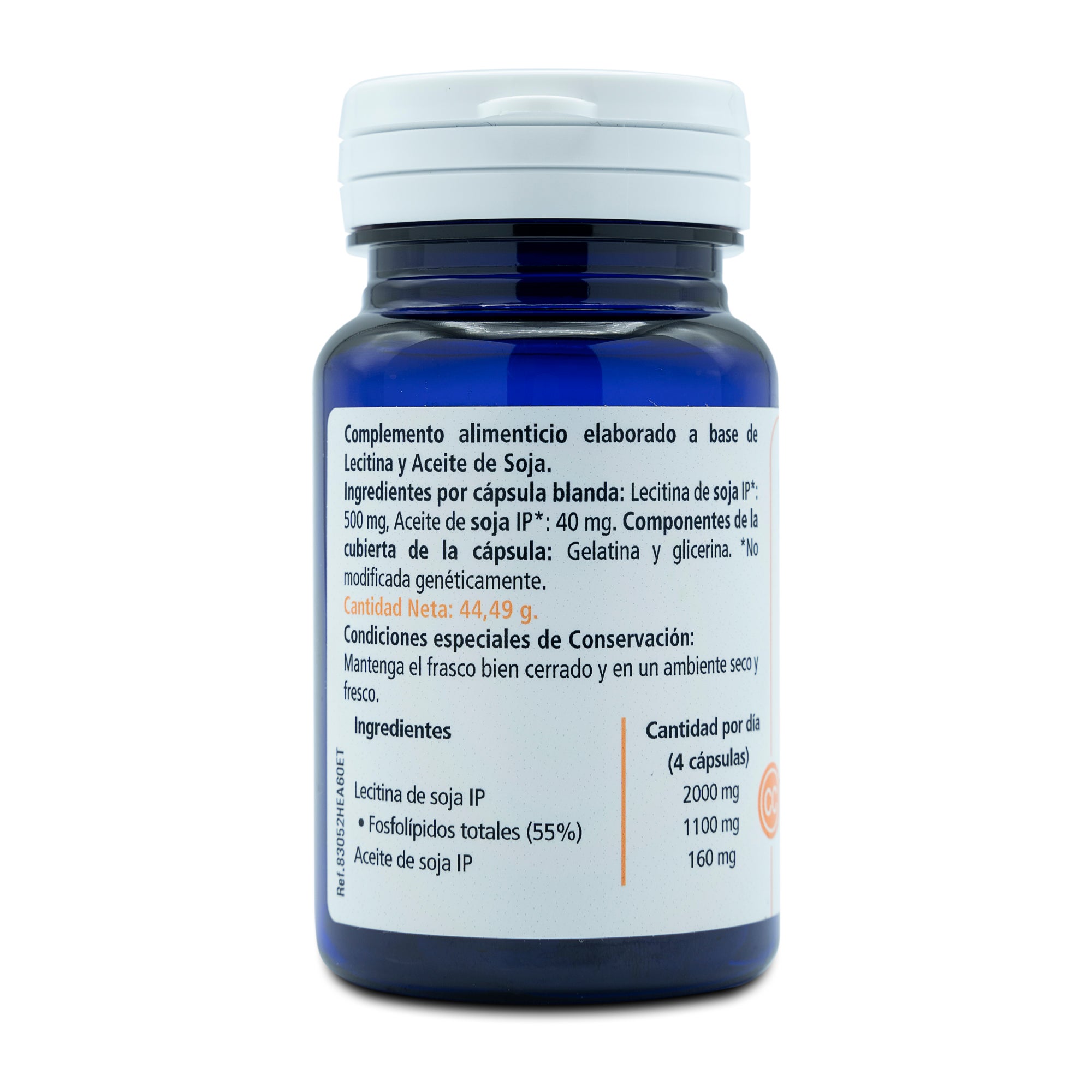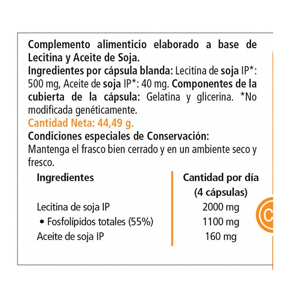 Ingredientes por cápsula blanda: Lecitina de soja IP*: 500 mg, Aceite de soja IP*: 40mg.