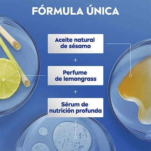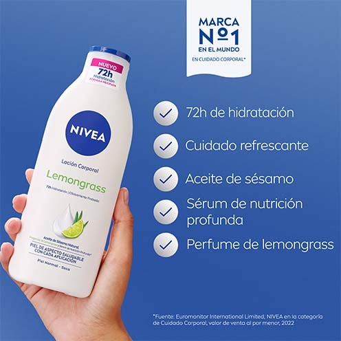 NIVEA Loção Corporal Lemongrass enriquecida com Soro de Hidratação Profunda, Óleo de Gergelim e refrescante aroma de Lemongrass oferece à sua pele um Cuidado Completo 5em1. Seus óleos nutritivos, conseguem ligar e retenir a água na pele, evitando assim que a hidratação possa evaporar facilmente. A pele fica bem protegida da desidratação, pois reduz a perda de água e aumenta o nível de hidratação da pele. Os métodos de teste mais recentes demonstraram que esta perfeita combinação de ingredientes de alta qualidade presentes tanto no leite corporal nutritivo quanto nas demais loções da NIVEA que incluem o Soro de Hidratação Profunda, conseguem penetrar profundamente na pele, retendo a água em seu interior e proporcionando uma hidratação profunda durante 48 horas.