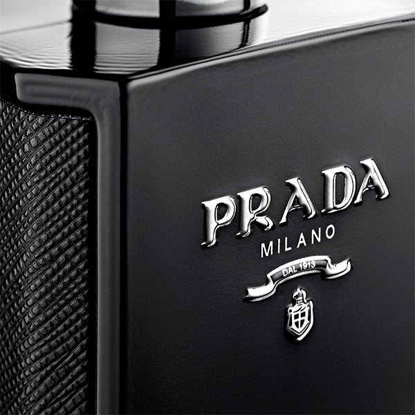 O frasco de perfume está envolto no icônico Prada Saffiano preto. O logo original de Prada aparece em relevo em prata na parte frontal do frasco laqueado em preto.
