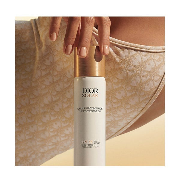 O óleo solar Dior Solar Óleo Protetor para Rosto e Corpo SPF 15 é aplicado com a ajuda de um vaporizador para envolver a pele e o cabelo em um véu acetinado. Este prático óleo é aplicado facilmente e de forma homogênea.