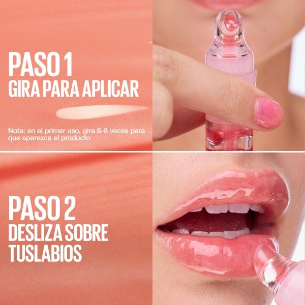 Gire o pescoço do aplicador até liberar o produto (6–8 cliques na primeira vez), aplique diretamente sobre os lábios com a ponta ergonômica.