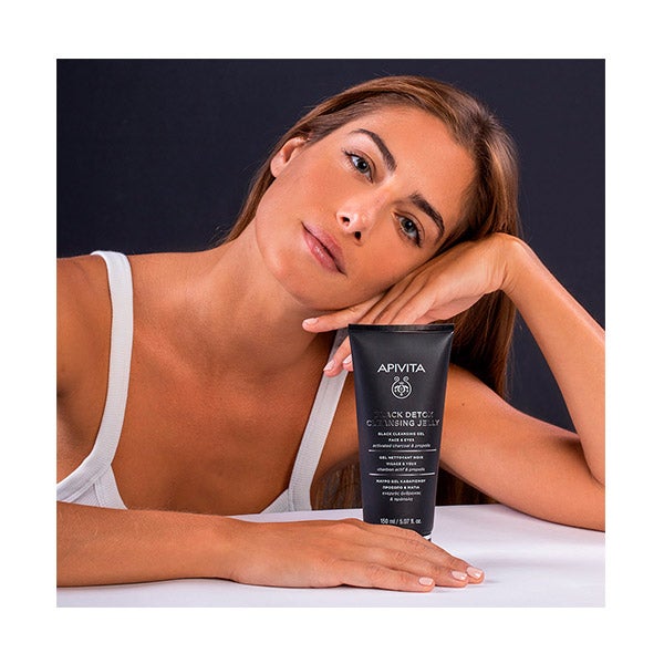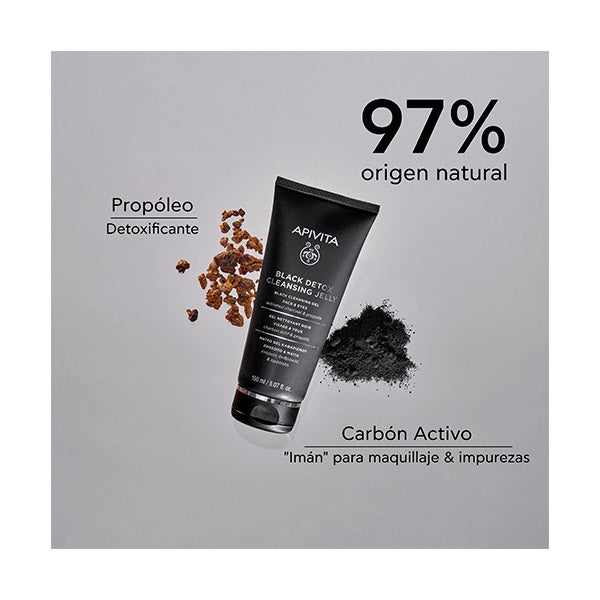 Gel de limpeza preto detox com carvão ativado e própolis que limpa eficazmente o rosto e os olhos sem ressecar a pele.