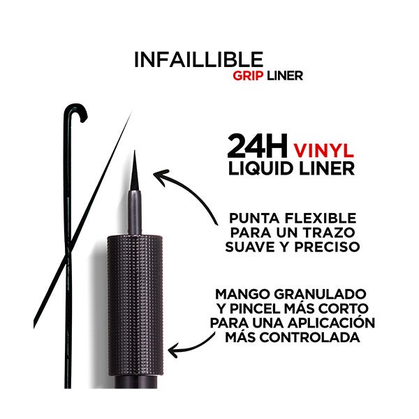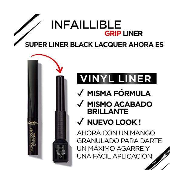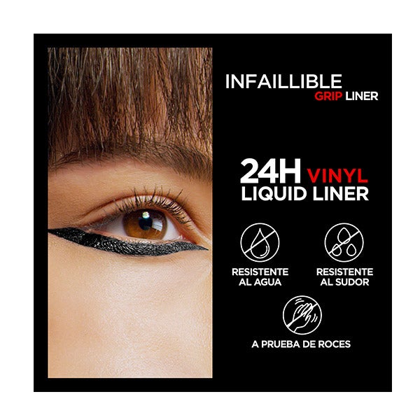 Exiba um olhar espetacular com o delineado mais preto e mais brilhante com o novo Infaillible Liquid Liner Vinyl Black 24hr com Acabamento Ultra Brilho da L'Oréal Paris e crie os looks mais ousados com seu novo cabo granulado, sua ponta flexível e uma fórmula que resiste à água, ao suor e aos borrões por até 24 horas.