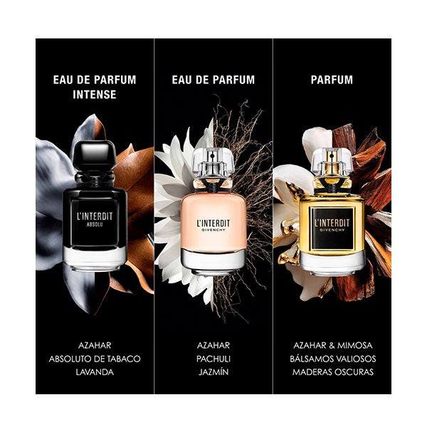 L'Interdit Parfum revela um aroma floral amadeirado e balsâmico sensual. Com a infusão da suavidade da essência de amêndoa amarga, o icônico buquê branco de L'Interdit composto de flor de laranjeira, tuberosa e jasmim, mistura-se com as notas florais e aveludadas do absoluto de mimosa. A mistura exclusiva de vetiver e patchouli revela o rastro balsâmico mais elegante e cativante.